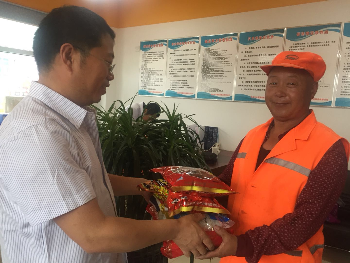 端午節(jié)來臨之際,為弘揚(yáng)傳統(tǒng)文化,我公司按照傳統(tǒng)習(xí)俗為環(huán)衛(wèi)工準(zhǔn)備了節(jié)日禮品。濃濃棕香,綿綿情長。6月5日下午,在一年一度的端午佳節(jié)來臨之際,一袋袋香香的糯米、大大的紅棗、白糖、冰糖飽含著公司關(guān)愛和祝福的端陽節(jié)福利由公司領(lǐng)導(dǎo)親自發(fā)放到為美化城區(qū)大街小巷作出默默奉獻(xiàn)的公司環(huán)衛(wèi)工人手中。
