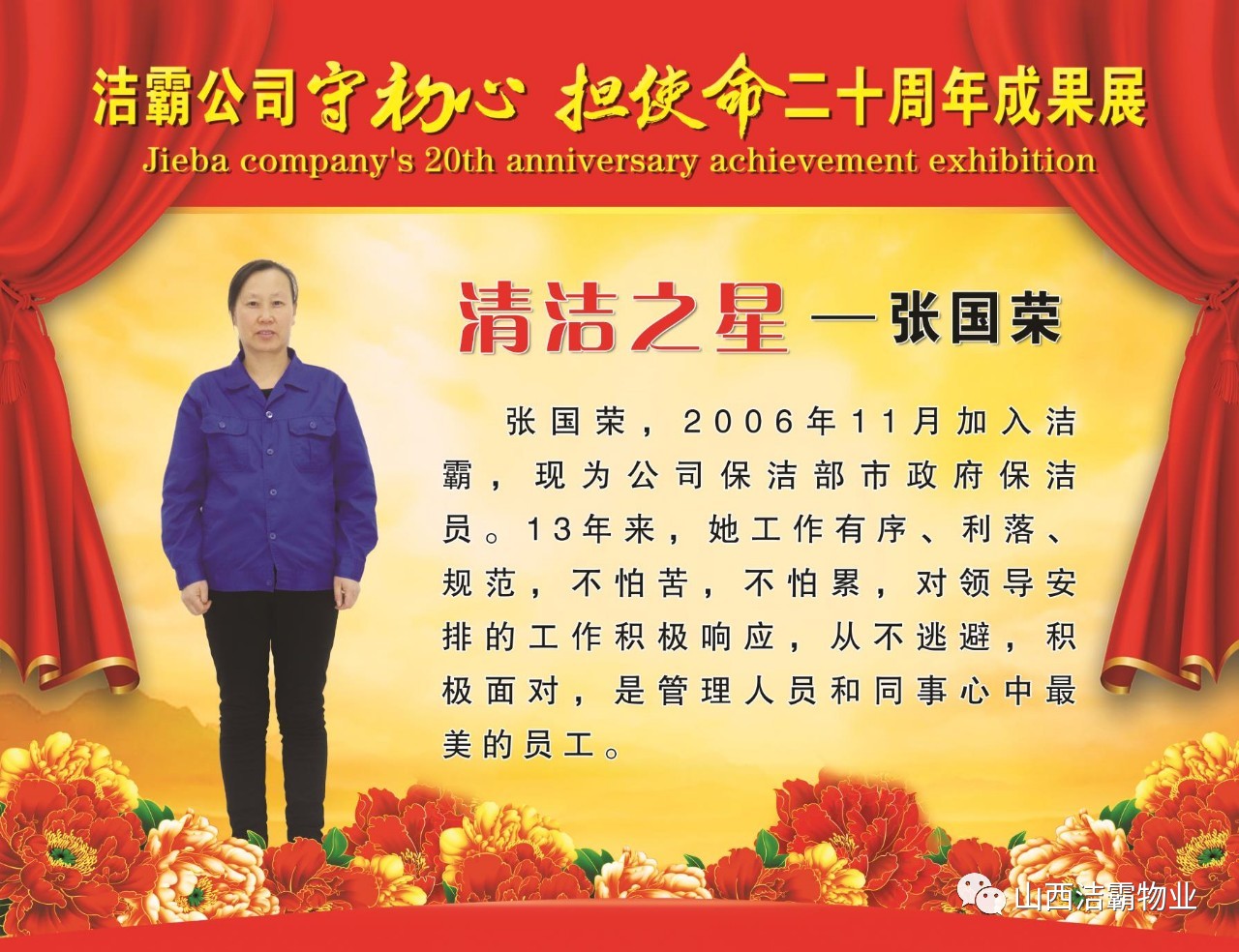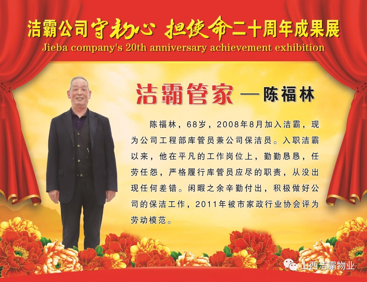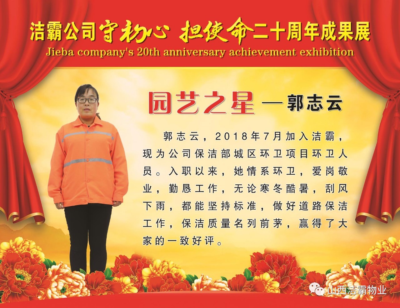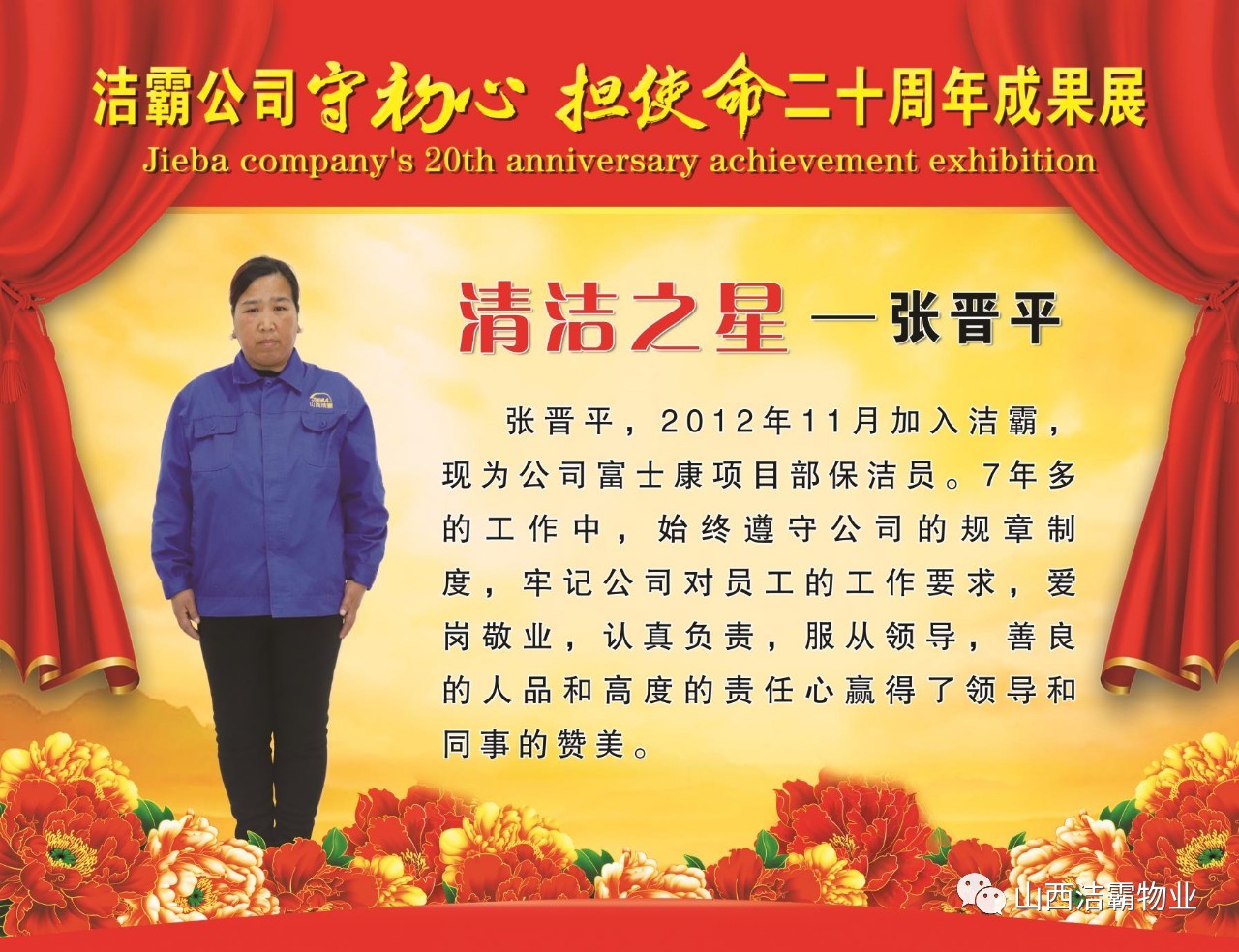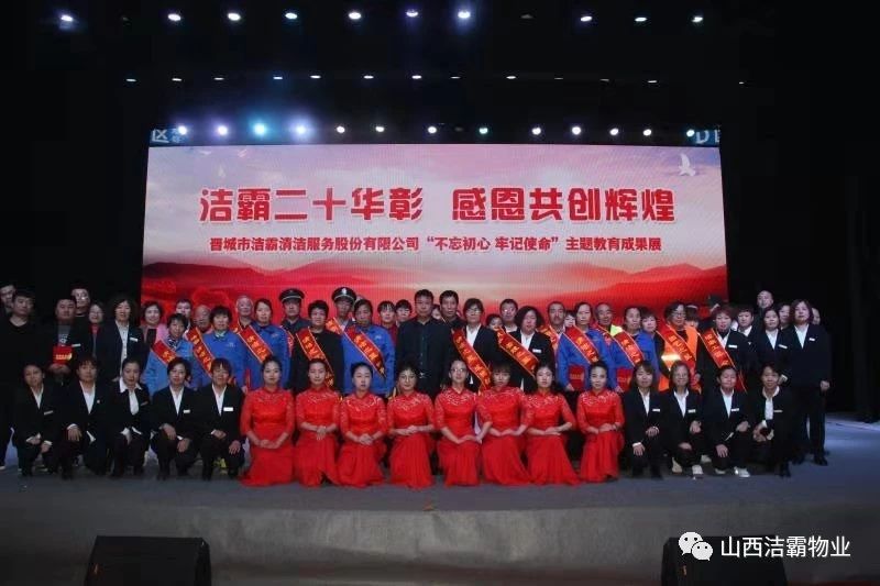 本次晚會以“潔霸二十華彰,感恩共創(chuàng)輝煌”為主題,此次慶典的核心思想是“感恩”,主要角色是潔霸的創(chuàng)業(yè)者。為此,公司對入職潔霸的創(chuàng)業(yè)功勛和一線員工進(jìn)行了表彰獎勵。本次晚會共設(shè)8個獎項(xiàng),包括“潔霸先鋒”“奉獻(xiàn)之星”“管理之星”“潔霸管家”“潔霸工匠”“清潔之星”“潔霸衛(wèi)士”“園藝之星”等。他們是:李山虎、張永智、史志霞、陳福林、王紅軍、余艷青、劉二丑、成艷粉、楊改梅、王書玲、張國榮、耿竹青、張粉霞、宋秋苗、陳先梅、張晉平、張偉山、趙瑞軍、王廣平、郭志云。晉城市原副市長成育廷、晉城市商務(wù)局原局長王新善、晉城市非公和社會組織工委書記郎軍芳、晉城市婦聯(lián)三級調(diào)研員李蓮菊、晉城市總工會商貿(mào)輕紡煙草服務(wù)業(yè)工會主席張玉濤、晉城市城區(qū)財(cái)政局局長翟明太等領(lǐng)導(dǎo)為他們頒獎。