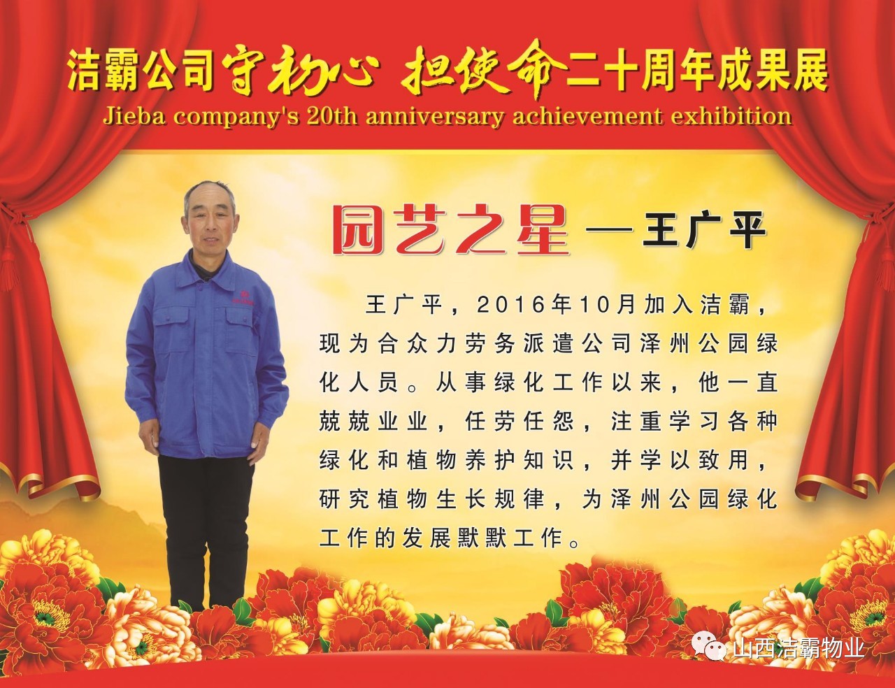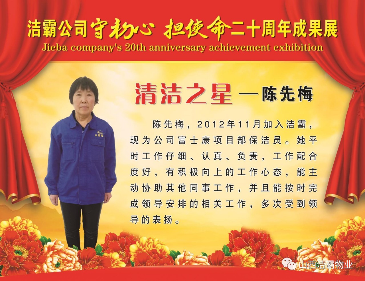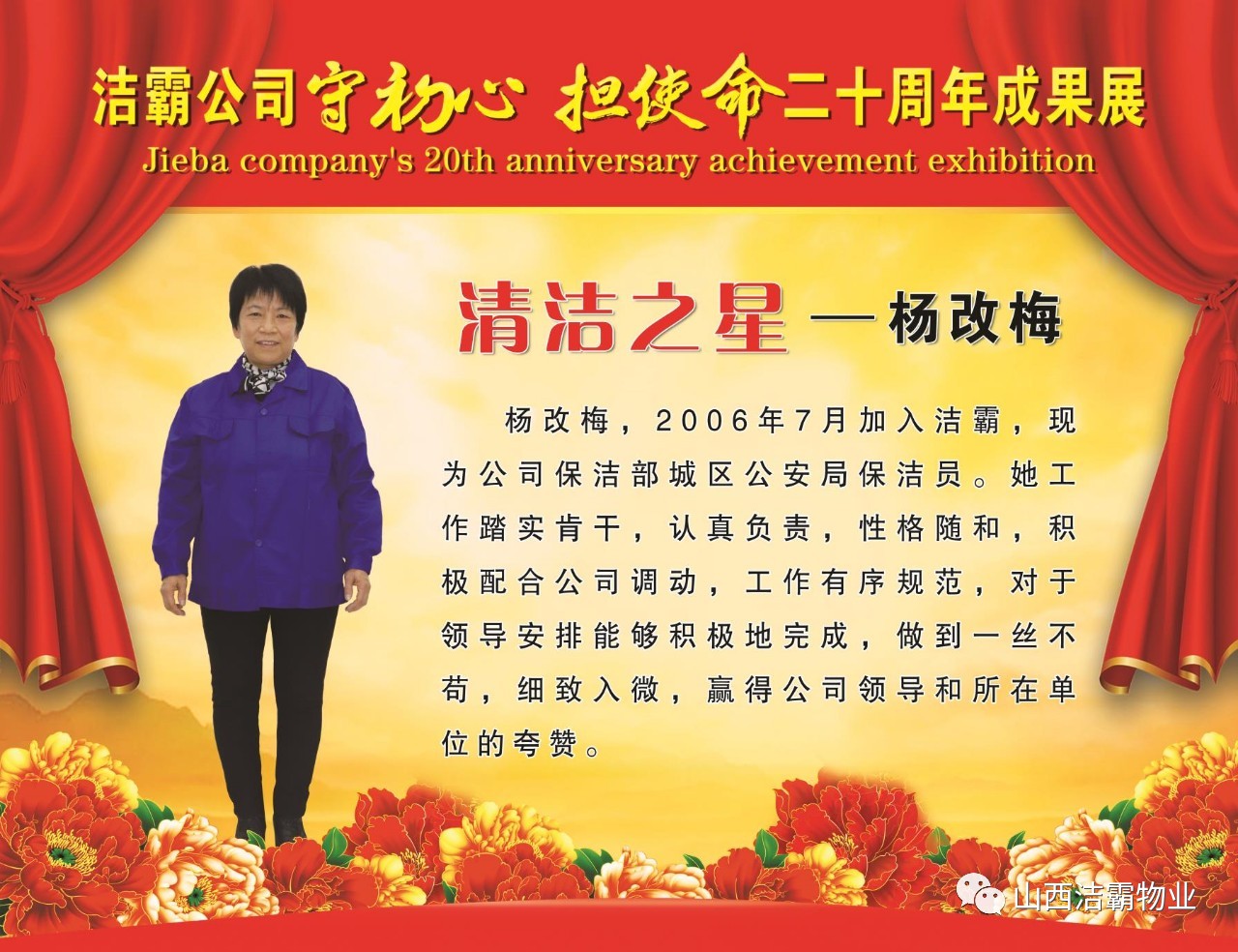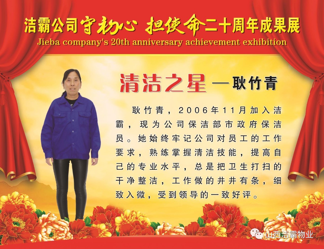 本次晚會以“潔霸二十華彰,感恩共創(chuàng)輝煌”為主題,此次慶典的核心思想是“感恩”,主要角色是潔霸的創(chuàng)業(yè)者。為此,公司對入職潔霸的創(chuàng)業(yè)功勛和一線員工進(jìn)行了表彰獎勵。本次晚會共設(shè)8個獎項(xiàng),包括“潔霸先鋒”“奉獻(xiàn)之星”“管理之星”“潔霸管家”“潔霸工匠”“清潔之星”“潔霸衛(wèi)士”“園藝之星”等。他們是:李山虎、張永智、史志霞、陳福林、王紅軍、余艷青、劉二丑、成艷粉、楊改梅、王書玲、張國榮、耿竹青、張粉霞、宋秋苗、陳先梅、張晉平、張偉山、趙瑞軍、王廣平、郭志云。晉城市原副市長成育廷、晉城市商務(wù)局原局長王新善、晉城市非公和社會組織工委書記郎軍芳、晉城市婦聯(lián)三級調(diào)研員李蓮菊、晉城市總工會商貿(mào)輕紡煙草服務(wù)業(yè)工會主席張玉濤、晉城市城區(qū)財(cái)政局局長翟明太等領(lǐng)導(dǎo)為他們頒獎。