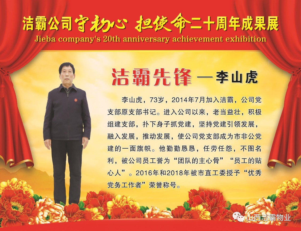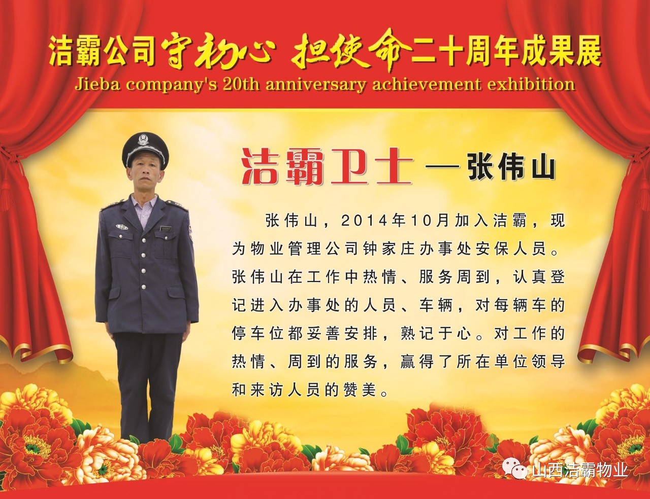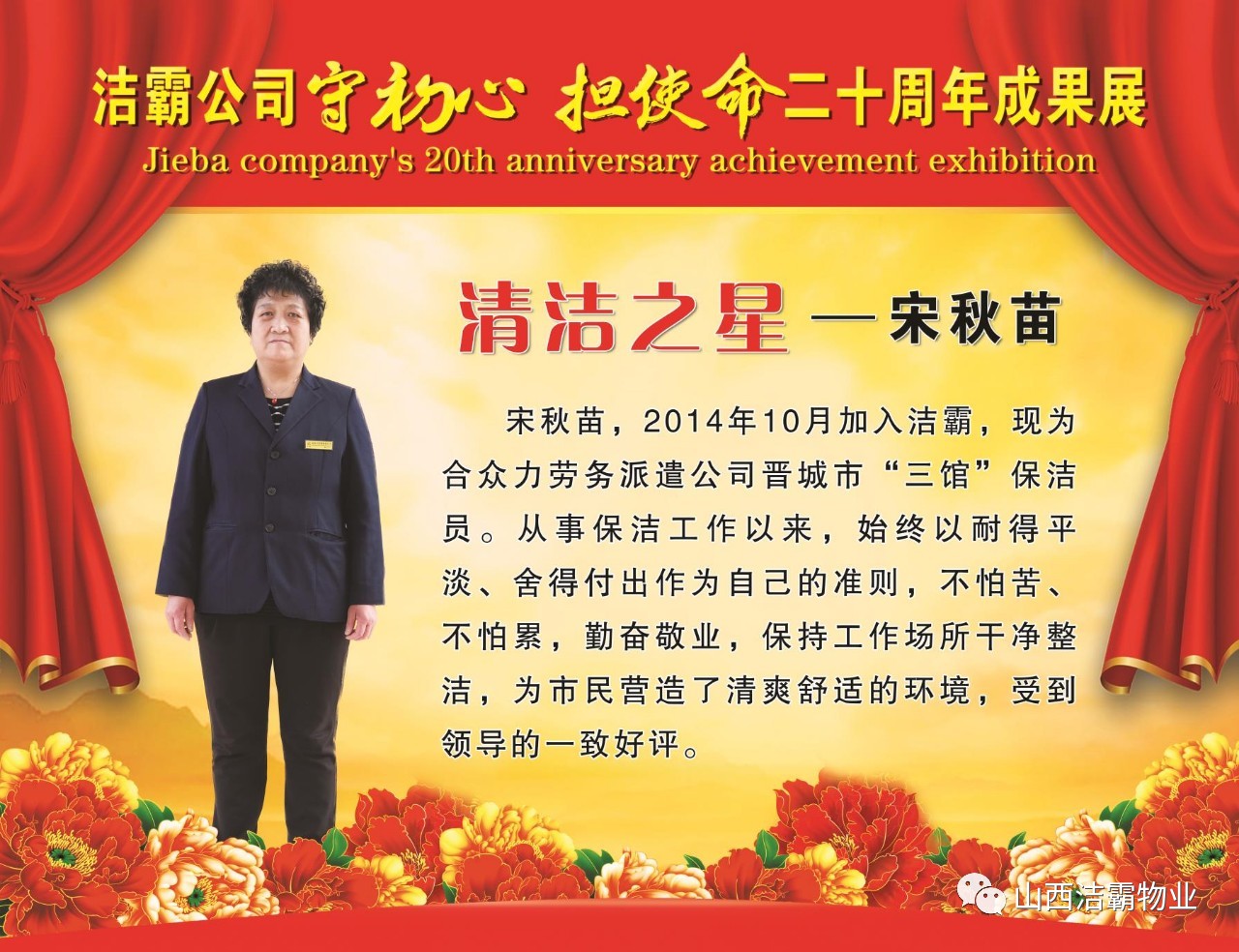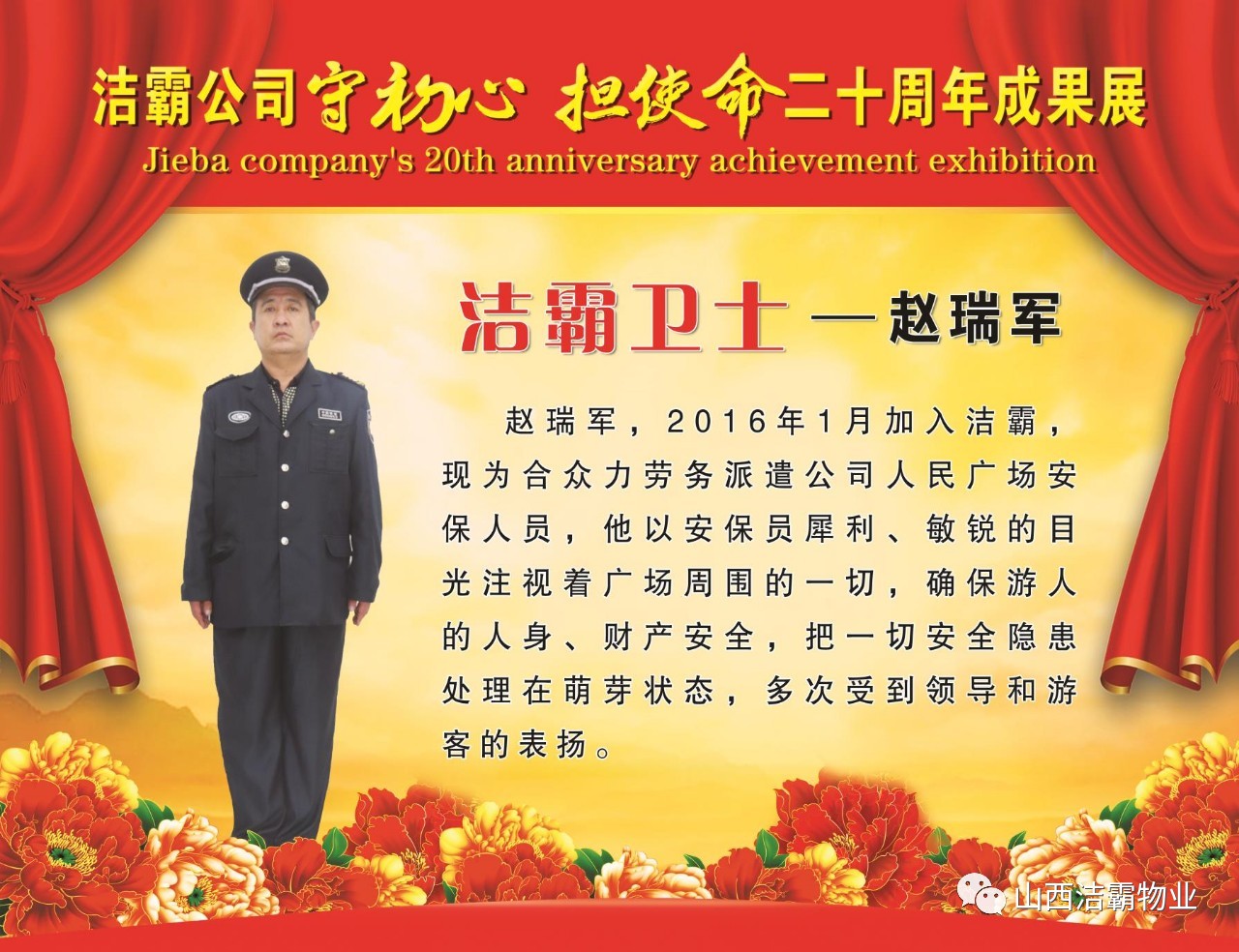 本次晚會以“潔霸二十華彰,感恩共創(chuàng)輝煌”為主題,此次慶典的核心思想是“感恩”,主要角色是潔霸的創(chuàng)業(yè)者。為此,公司對入職潔霸的創(chuàng)業(yè)功勛和一線員工進(jìn)行了表彰獎勵。本次晚會共設(shè)8個獎項(xiàng),包括“潔霸先鋒”“奉獻(xiàn)之星”“管理之星”“潔霸管家”“潔霸工匠”“清潔之星”“潔霸衛(wèi)士”“園藝之星”等。他們是:李山虎、張永智、史志霞、陳福林、王紅軍、余艷青、劉二丑、成艷粉、楊改梅、王書玲、張國榮、耿竹青、張粉霞、宋秋苗、陳先梅、張晉平、張偉山、趙瑞軍、王廣平、郭志云。晉城市原副市長成育廷、晉城市商務(wù)局原局長王新善、晉城市非公和社會組織工委書記郎軍芳、晉城市婦聯(lián)三級調(diào)研員李蓮菊、晉城市總工會商貿(mào)輕紡煙草服務(wù)業(yè)工會主席張玉濤、晉城市城區(qū)財(cái)政局局長翟明太等領(lǐng)導(dǎo)為他們頒獎。