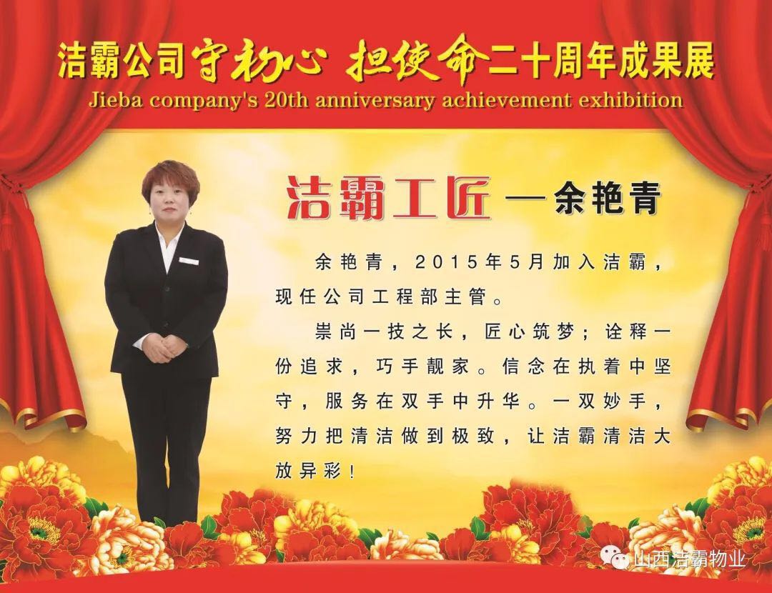 余艷青同志自2015年進(jìn)入潔霸以來(lái),一直奮斗在工程部的第一線從事主管工作。工作中,余艷青同志愛(ài)崗敬業(yè),遵守職業(yè)道德,為人誠(chéng)實(shí)守信;她熱愛(ài)工作,對(duì)待客戶(hù)熱情周到、耐心細(xì)致;工作中團(tuán)結(jié)同事,責(zé)任心強(qiáng),吃苦耐勞,服從大局,以公司的利益為重。在我市開(kāi)展的“三洗六見(jiàn)一紅旗”活動(dòng)和全國(guó)文明城市的創(chuàng)建活動(dòng)中,她帶領(lǐng)員工高標(biāo)準(zhǔn)、高質(zhì)量、高效率地完成清洗美化工作,為扮靚晉城形象,打造城市優(yōu)美環(huán)境做出了突出貢獻(xiàn)。先后多次被公司評(píng)為優(yōu)秀員工等,2019年在公司成立20周年慶之際,她又被公司授予“潔霸工匠”稱(chēng)號(hào)。