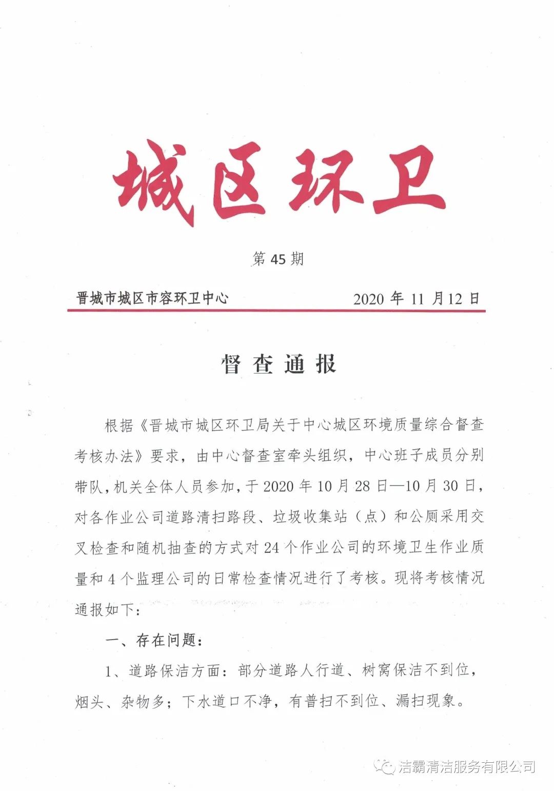 2020年10月28日—10月30日,晉城市城區(qū)市容環(huán)衛(wèi)中心由中心督查室牽頭組織,中心班子成員分別帶隊,機關(guān)全體人員參加,對各作業(yè)公司道路清掃路段、垃圾收集站(點)和公廁采用交叉檢查和隨機抽查的方式對24個作業(yè)公司的環(huán)境衛(wèi)生作業(yè)質(zhì)量和4個監(jiān)理公司的日常檢查情況進行了考核。晉城市潔霸清潔服務(wù)股份有限公司所屬的環(huán)衛(wèi)四公司分數(shù)最高,名列第一。