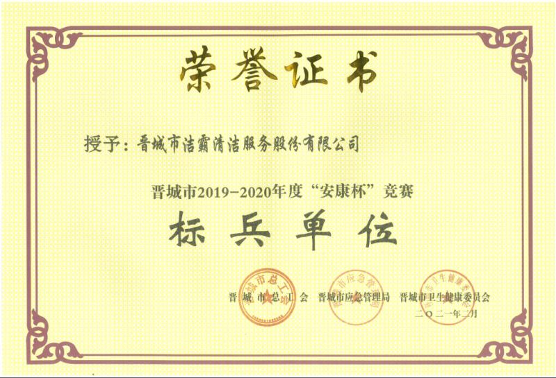 近兩年來(lái),潔霸公司深入貫徹落實(shí)黨中央、國(guó)務(wù)院和省委、省政府、市委、市政府關(guān)于加強(qiáng)安全生產(chǎn)的決策部署,積極組織開展以“強(qiáng)意識(shí),查隱患,促發(fā)展,保安康”為主題的“安康杯”競(jìng)賽活動(dòng),牢固樹立安全生產(chǎn)發(fā)展理念,弘揚(yáng)生命至上、安全第一的思想,精心組織領(lǐng)導(dǎo),在活動(dòng)中周密部署,有序推進(jìn),黨政重視,齊抓共管,被晉城市總工會(huì)、晉城市應(yīng)急管理局、晉城市衛(wèi)生健康委員會(huì)聯(lián)合授予“晉城市2019—2020年度‘安康杯’標(biāo)兵單位”榮譽(yù)稱號(hào)。