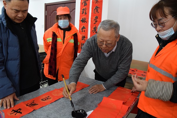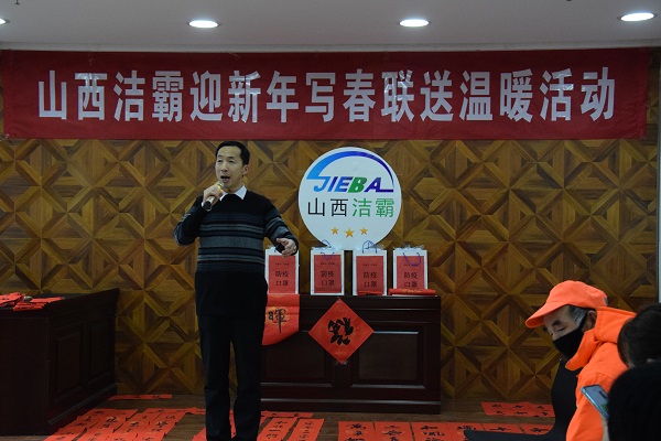 現(xiàn)場(chǎng)人頭攢動(dòng),熱鬧非凡,處處洋溢著歡樂(lè)喜慶的氣氛。賈大一老師剛執(zhí)墨筆,就吸引了現(xiàn)場(chǎng)數(shù)十名員工駐足觀賞。他的書法如行云流水,一副寓意著對(duì)新年美好祝福的春聯(lián)便一氣呵成。各位老師揮毫潑墨,一幅幅散發(fā)著清新墨香的春聯(lián)展現(xiàn)在大家面前!懊坊í(jiǎng)”獲得者張保平老師現(xiàn)場(chǎng)演唱上黨梆子戲曲名段,字正腔圓,渾厚豪邁,把活動(dòng)推向了高潮。市總工會(huì)副主席韓敦峰為員工分發(fā)了對(duì)聯(lián)和防疫口罩。