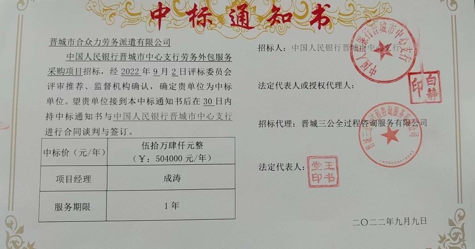 近日,晉城市合眾力勞務(wù)派遣有限公司收到《中標(biāo)通知書》,確定公司為中國人民銀行晉城市中心支行勞務(wù)外包服務(wù)采購項目的中標(biāo)人,中標(biāo)金額504000元。