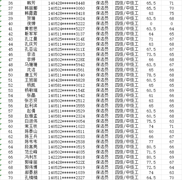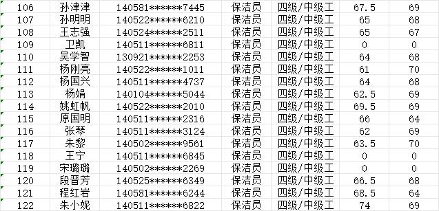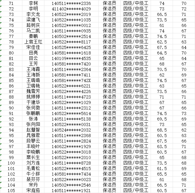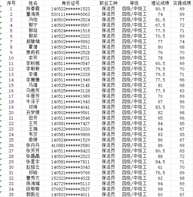 晉城市潔霸清潔服務(wù)股份有限公司職業(yè)技能等級(jí)認(rèn)定中心現(xiàn)將2024年1月20日認(rèn)定人員成績(jī)公示如下: