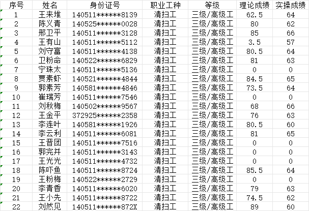 晉城市潔霸清潔服務(wù)股份有限公司職業(yè)技能等級(jí)認(rèn)定中心現(xiàn)將2024年6月23日認(rèn)定人員成績(jī)公示如下: