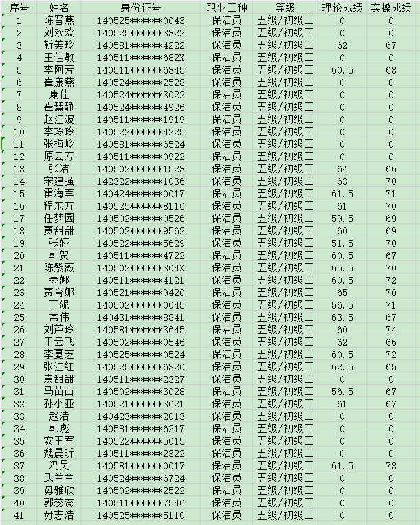 晉城市潔霸清潔服務(wù)股份有限公司職業(yè)技能等級(jí)認(rèn)定中心現(xiàn)將2024年8月4日認(rèn)定人員成績公示如下: