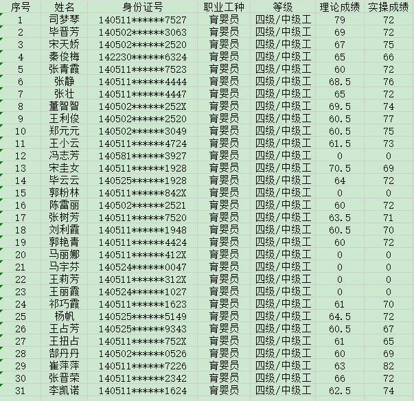 晉城市潔霸清潔服務(wù)股份有限公司職業(yè)技能等級認(rèn)定中心2024年9月27日第10批育嬰員中級認(rèn)定人員成績公示